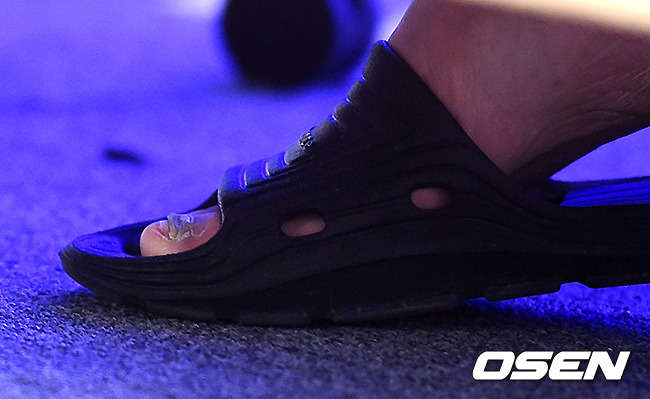사진은 경기후 기자회견장에서 호주 첫 등판서 부상당한 류현진의 발톱./ jpnews@osen.co.kr