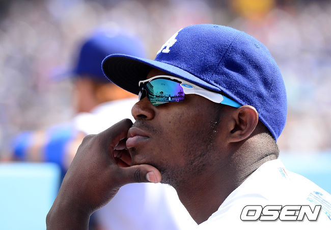 이날 야시엘 푸이그가 지각으로 명단에서 제외, 대신 멧 켐프가 선발로 나섰다. 푸이그가 더그아웃에서 경기를 지켜보고 있다. 푸이그는 타격 훈련을 마칠 무렵 경기장에 도착한 것으로 알려 졌다. ./ jpnews@osen.co.kr