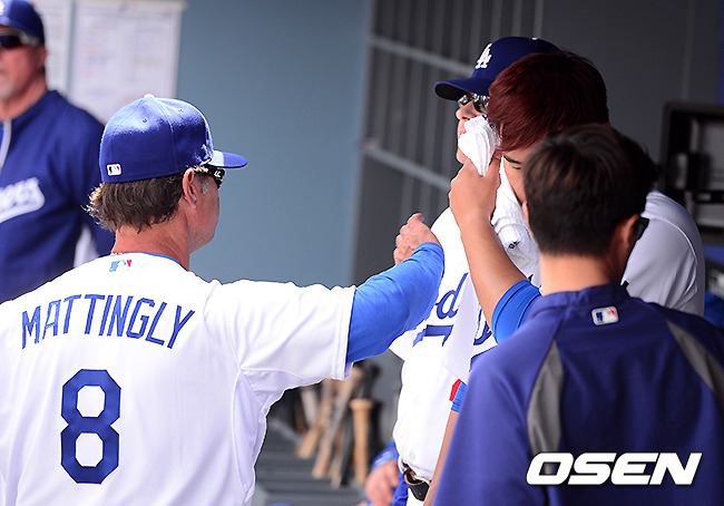 1회말 수비를 마치고 다저스 매팅리 감독이 류현진을 격려하고 있다. / jpnews@osen.co.kr