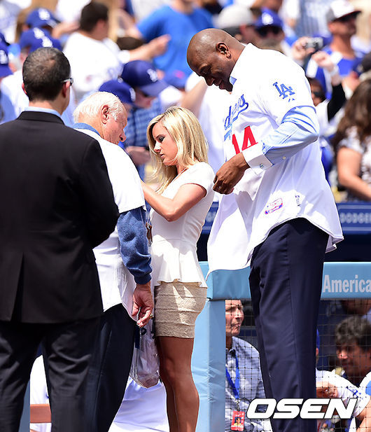 토미 라소다 다저스 고문과 매직 존슨 구단주가 식전 행사를 준비하고 있다. / jpnews@osen.co.kr