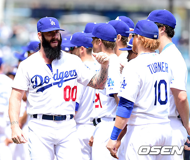 식전행사에서 다저스 윌슨이 동료선수들과 하이파이브를 하며 입장하고 있다. / jpnews@osen.co.kr