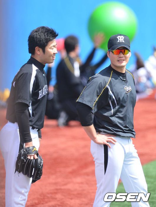 오승환이 5일 오후 일본 도쿄 메이지 진구구장에서 열리는 '2014 일본프로야구' 야쿠르트 스왈로스 대 한신 타이거스의 경기를 앞두고 팀 동료 에노키다 다이키와 대화를 나누고 있다.