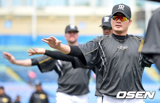 오승환이 5일 오후 일본 도쿄 메이지 진구구장에서 열리는 '2014 일본프로야구' 야쿠르트 스왈로스 대 한신 타이거스의 경기를 앞두고 팀 동료들과 스트레칭으로 몸을 풀고 있다.