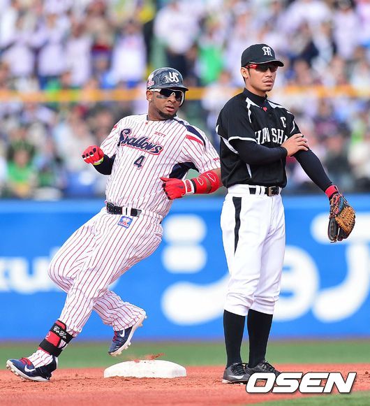 2회말 야쿠르트 공격 1사 1, 2루 상황 발렌틴이 적시 우익수 키를 넘기는 안타를 날린 뒤 상대 실책을 틈타 2루까지 진루하고 있다. 1, 2루 주자 모두 홈인.