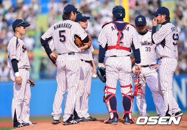 3회초 한신 공격 무사 만루 상황에서 야쿠르트 선발 이시가와를 비롯한 야수진이 모두모여 대화를 나누고 있다.