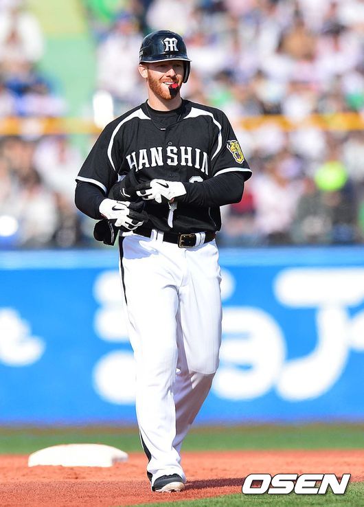 3회초 한신 공격 1사 만루 상황 맷 머튼이 좌측 싹쓸이 3타점 2루타를 날리고 2루에 안착해 장갑을 벗고 있다.