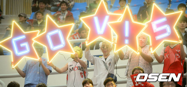 5일 오후 울산광역시 중구 동천체육관 열린 'KB 국민카드 2013-2014 프로농구' 울산 모비스와-창원 LG의 챔피언결정 3차전, 모비스 응원단이 가면을 쓰고 응원을 펼치고 있다.
