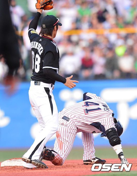 5회말 야쿠르트 공격 2사 1, 2루 상황 3루수 키를 넘기는 안타를 날린 유헤이가 상대 송구를 틈타 2루까지 내달렸지만 아웃된 뒤 아쉬워하고 있다.
