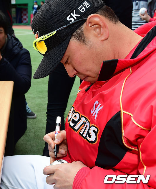 경기에 앞서, 박경완 SK 2군 감독이 팬들에게 사인을 해주고 있다.