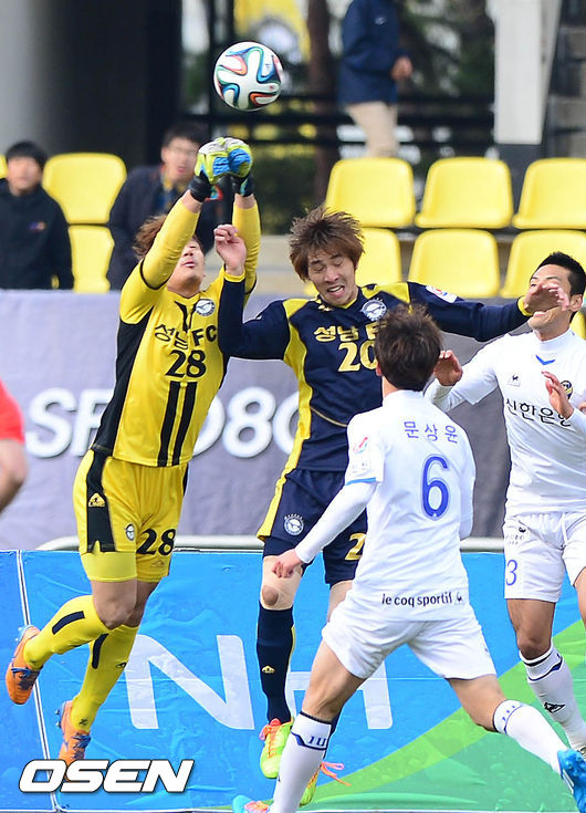 5일 오후 성남시 탄천종합운동장에서 열린 '현대오일뱅크 K리그 클래식 2014' 성남 FC와 인천 유나이티드의 경기 전반 성남 박준혁이 슛을 막아내고 있다.