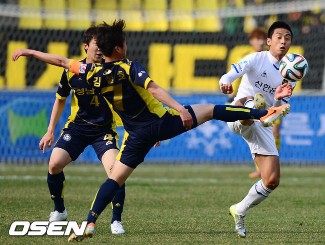 5일 오후 성남시 탄천종합운동장에서 열린 '현대오일뱅크 K리그 클래식 2014' 성남 FC와 인천 유나이티드의 경기 전반 성남 김철호가 볼다툼을 하고 있다.