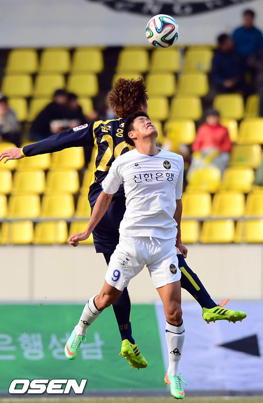 5일 오후 성남시 탄천종합운동장에서 열린 '현대오일뱅크 K리그 클래식 2014' 성남 FC와 인천 유나이티드의 경기 전반 설기현과 윤영선이 공중볼 다툼을 하고 있다.
