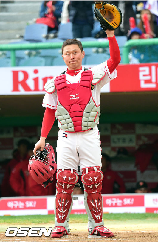 은퇴식을 앞둔 SK 박경완 2군 감독이 시포에 앞서 인사를 하고 있다.