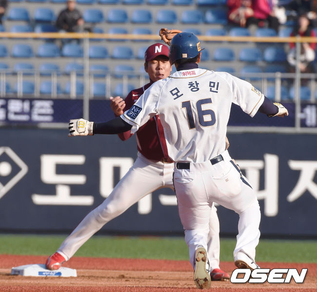 5일 오후 창원시 마산구장에서 열린 '2014 한국야쿠르트 세븐 프로야구' NC 다이노스와 넥센 히어로즈 경기, 1회말 1사 1루 이종욱의 내야땅볼때 1루 주자 모창민 2루에서 포스아웃 되고 있다.