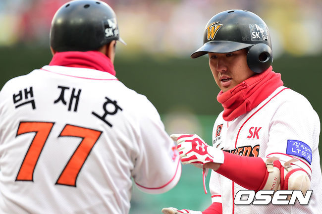 1회말 1사 3루에서 SK 최정이 좌중간을 가르는 적시타를 치고 백재호 코치와 하이파이브를 하고 있다.
