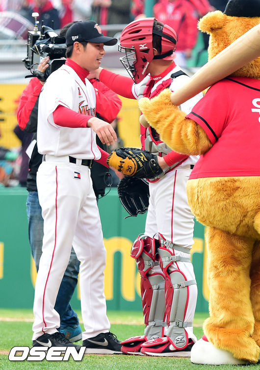 은퇴식을 앞둔 SK 박경완 2군 감독이 시구를 마치고 김원형 코치와 포옹을 나누고 있다.