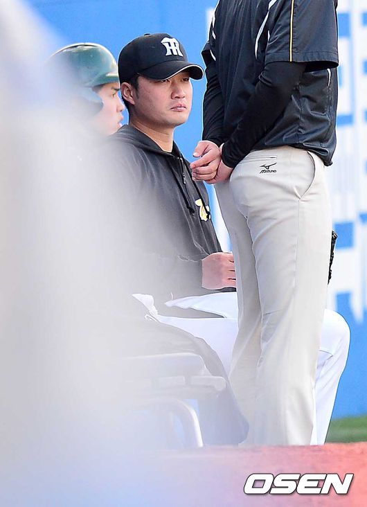 8회말 야쿠르트 공격이 진행되는 가운데 오승환이 외야 불펜에서 경기를 지켜보고 있다.