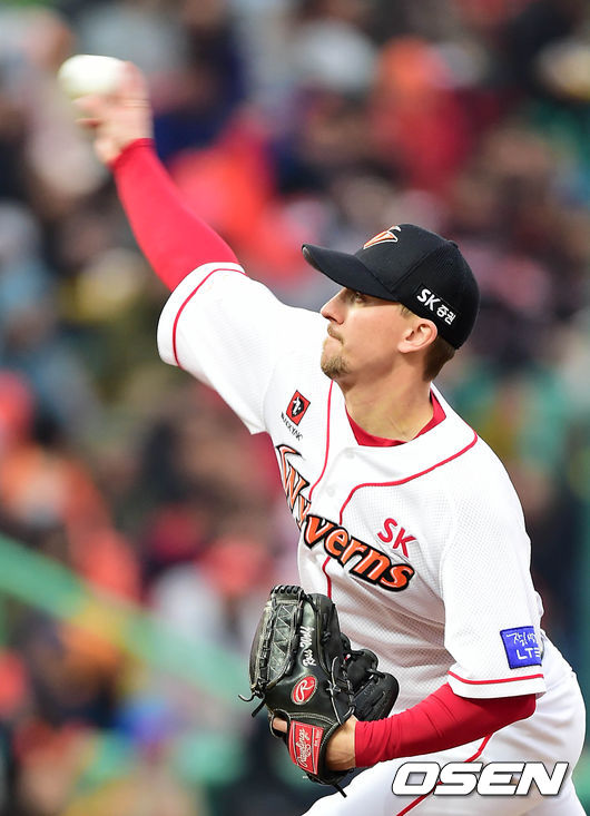 1회초 SK 선발투수 울프가 힘차게 공을 던지고 있다.