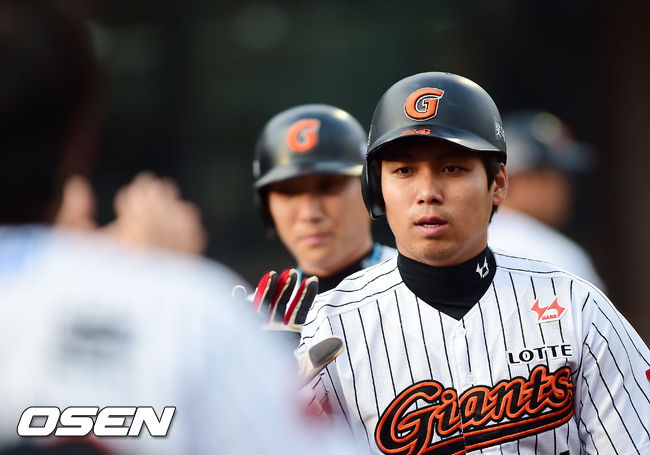 5일 오후 울산 문수야구장에서 열린 '2014 한국야쿠르트 세븐 프로야구' 롯데 자이언츠와 삼성 라이온즈의 경기, 1회말 무사 주자 만루 롯데 최준석이 초구를 노려 좌익수 왼쪽 2타점 적시타를 날려 홈을 밟은 김문호 이승화가 덕아웃에서 동료들과 하이파이브를 하고 있다.