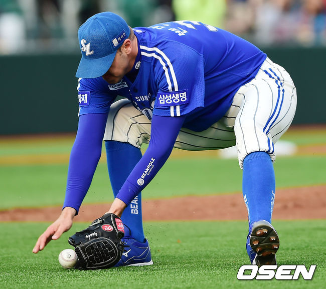 5일 오후 울산 문수야구장에서 열린 '2014 한국야쿠르트 세븐 프로야구' 롯데 자이언츠와 삼성 라이온즈의 경기, 1회말 무사 주자 1,2루 롯데 박종윤의 희생번트때 삼성 선발 밴덴헐크가 볼을 줍고 있다.