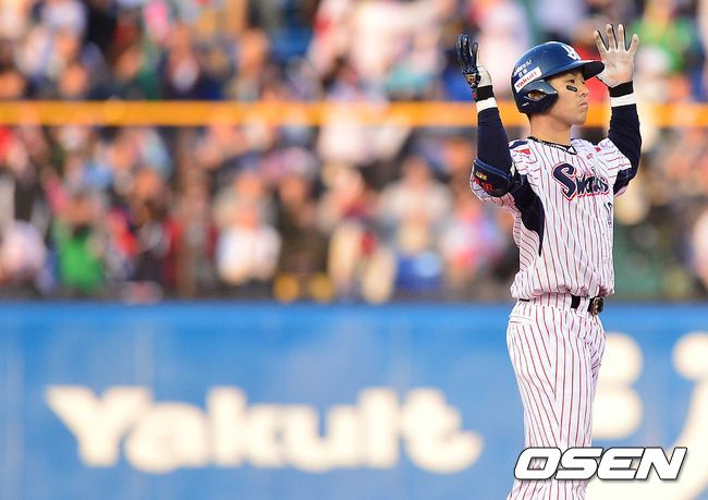8회말 야쿠르트 공격 1사 3루 상황 모리오카 료스케가 1타점 우익선상 2루타를 날린 뒤 2루에 안착해 환호하고 있다.