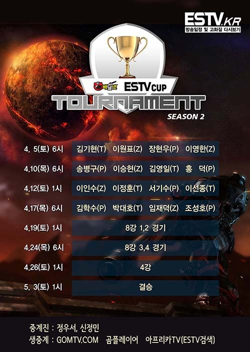 16강 조별토너먼트로 진행되는 이번 대회는 아프리카TV 및 곰TV 그리고 estv.kr에서 PC와 모바일을 이용해 시청할수 있다.