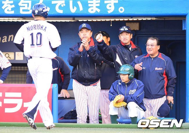 8회말 야쿠르트 공격 2사 2루 상황 야마다의 적시타로 홈을 밟은 주자 모리오카 료스케가 오가와 감독과 인사를 나누고 있다.