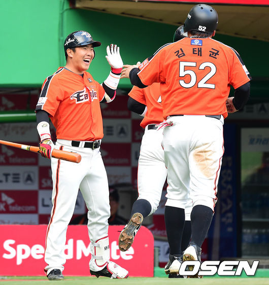 2회초 2사 만루에서 한화 김민수의 우중간을 가르는 2타점 적시타 때 홈을 밟은 2루주자 송광민과 3루주자 김태균이 정근우와 하이파이브를 하고 있다.