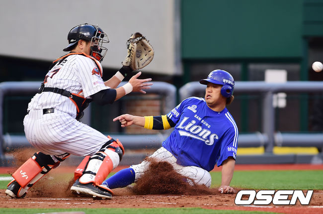 5일 오후 울산 문수야구장에서 열린 '2014 한국야쿠르트 세븐 프로야구' 롯데 자이언츠와 삼성 라이온즈의 경기, 2회초 무사 주자 2루 삼성 이승엽이 중월 투런 홈런성 타구를 날렸을때 2루 주자 박석민이 홈으로 몸을 던지고 있다.