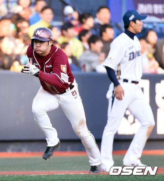 5일 오후 창원시 마산구장에서 열린 '2014 한국야쿠르트 세븐 프로야구' NC 다이노스와 넥센 히어로즈 경기,3회초 1사 1,3루 강정호의 희생플라이때 역전 안타를 날린 3루주자 문우람이 태그업 득점을 올리고 있다.