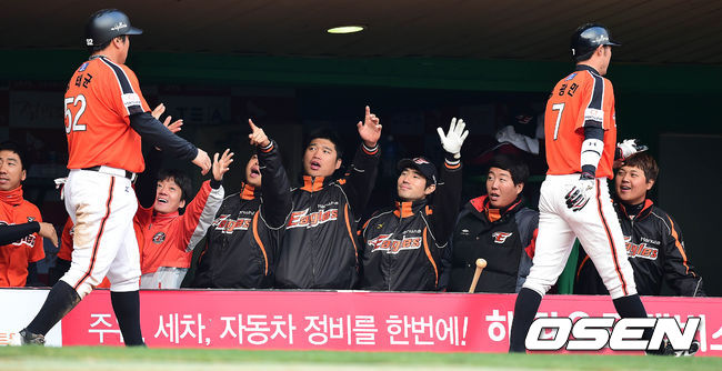2회초 2사 만루에서 한화 김민수의 우중간을 가르는 2타점 적시타 때 홈을 밟은 2루주자 송광민과 3루주자 김태균이 더그아웃에서 동료들과 하이파이브를 하고 있다.