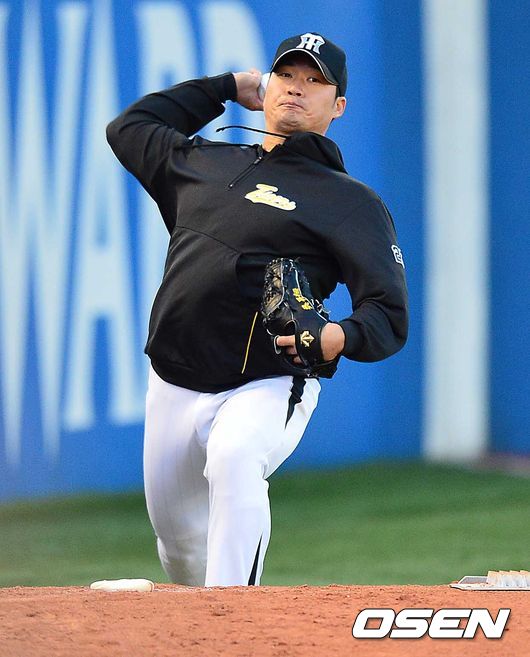 9회초 한신 공격, 팀이 10-12로 뒤지고 있는 가운데 한신 마무리투수 오승환이 외야 불펜에서 몸을 풀고 있다.