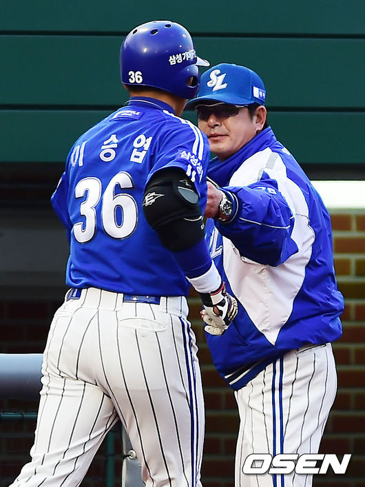 5일 오후 울산 문수야구장에서 열린 '2014 한국야쿠르트 세븐 프로야구' 롯데 자이언츠와 삼성 라이온즈의 경기, 2회초 무사 주자 2루 삼성 이승엽이 롯데 유먼을 상대로 중월 투런 홈런을 날린 후 덕아웃에서 류중일 감독과 하이파이브를 하고 있다.