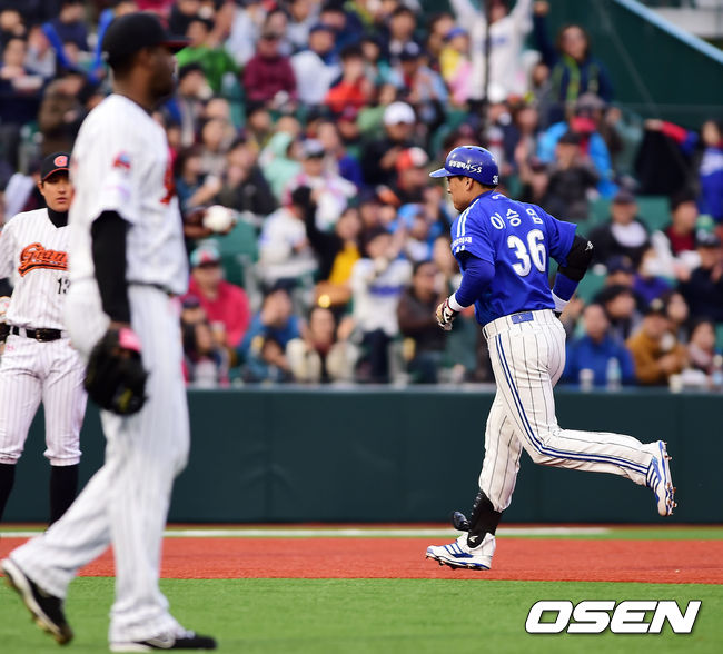 5일 오후 울산 문수야구장에서 열린 '2014 한국야쿠르트 세븐 프로야구' 롯데 자이언츠와 삼성 라이온즈의 경기, 2회초 무사 주자 2루 삼성 이승엽이 롯데 유먼을 상대로 중월 투런 홈런을 날린 후 그라운드를 돌고 있다.