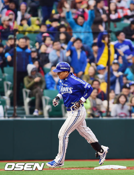 5일 오후 울산 문수야구장에서 열린 '2014 한국야쿠르트 세븐 프로야구' 롯데 자이언츠와 삼성 라이온즈의 경기, 2회초 무사 주자 2루 삼성 이승엽이 롯데 유먼을 상대로 중월 투런 홈런을 날린 후 그라운드를 돌고 있다.