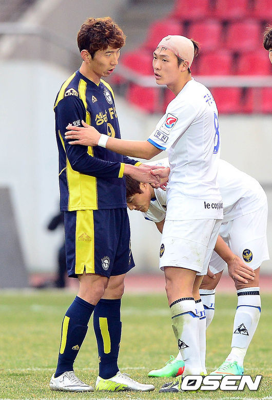 5일 오후 성남시 탄천종합운동장에서 열린 '현대오일뱅크 K리그 클래식 2014' 성남 FC와 인천 유나이티드의 경기 종료 후 성남 김동섭과 인천 구본상이 인사를 나누고 있다.