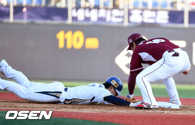 5일 오후 창원시 마산구장에서 열린 '2014 한국야쿠르트 세븐 프로야구' NC 다이노스와 넥센 히어로즈 경기,3회말 1사 2루 이종욱 타석때 2루주자 오정복 넥센 강윤구 투수의 견제구에 2루에서 태그아웃 처리되고 있다.