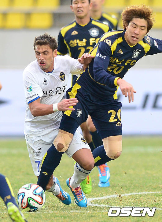 5일 오후 성남시 탄천종합운동장에서 열린 '현대오일뱅크 K리그 클래식 2014' 성남 FC와 인천 유나이티드의 경기 후반 인천 이보와 성남 윤영선이 볼다툼을 하고 있다.