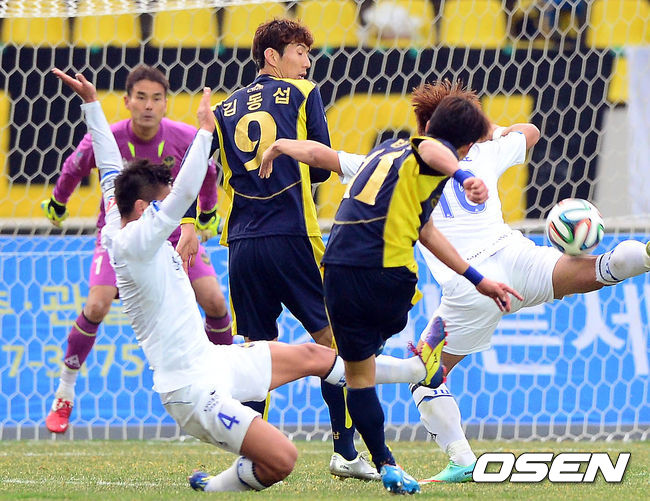 5일 오후 성남시 탄천종합운동장에서 열린 '현대오일뱅크 K리그 클래식 2014' 성남 FC와 인천 유나이티드의 경기 후반 성남 김태환이 슛을 시도하고 있다.