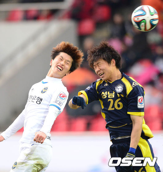 5일 오후 성남시 탄천종합운동장에서 열린 '현대오일뱅크 K리그 클래식 2014' 성남 FC와 인천 유나이티드의 경기 인천 문상윤이 헤딩슛을 시도하고 있다.