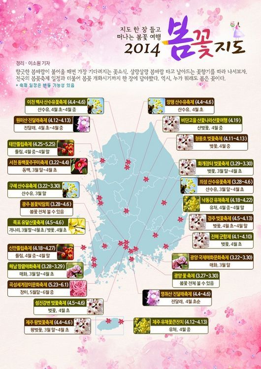 한국관광공사는 홈페이지를 통해 전국 봄꽃 축제 일정과 봄꽃 개화시기를 담은 ‘2014 봄꽃 지도’를 공개했다.