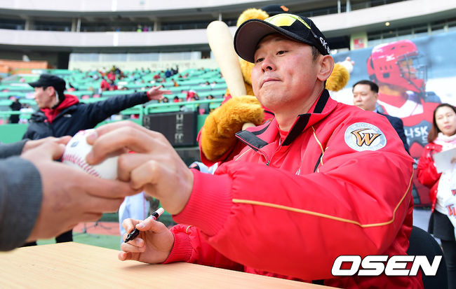 경기에 앞서 박경완 SK 2군 감독이 팬들에게 사인을 해주고 있다.