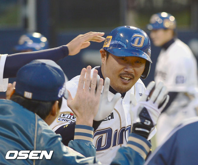 5일 오후 창원시 마산구장에서 열린 '2014 한국야쿠르트 세븐 프로야구' NC 다이노스와 넥센 히어로즈 경기,5회말 1사 만루 이호준 역전 만루홈런을 날리고 동료들의 축하를 받고 있다.