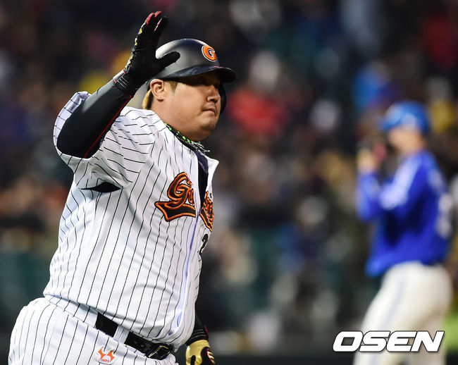 5일 오후 울산 문수야구장에서 열린 '2014 한국야쿠르트 세븐 프로야구' 롯데 자이언츠와 삼성 라이온즈의 경기, 5회말 2사 주자 1루 롯데 최준석이 좌중월 투런 홈런을 날린 후 그라운드를 돌고 있다.