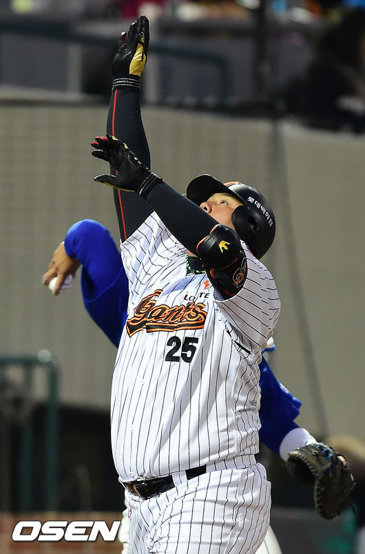 5일 오후 울산 문수야구장에서 열린 '2014 한국야쿠르트 세븐 프로야구' 롯데 자이언츠와 삼성 라이온즈의 경기, 5회말 2사 주자 1루 롯데 최준석이 삼성 선발 밴덴헐크를 상대로 좌중월 투런 홈런을 날린 후 홈을 밟으며 세레모니를 하고 있다.