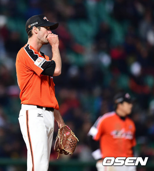 6회말 2사 3루 SK 김성현에 우전 적시타를 허용한 한화 클레이가 아쉬운 표정을 짓고 있다.