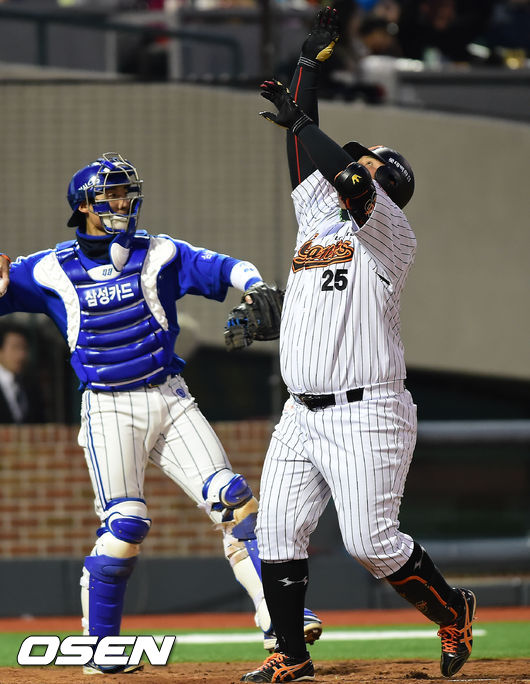 5일 오후 울산 문수야구장에서 열린 '2014 한국야쿠르트 세븐 프로야구' 롯데 자이언츠와 삼성 라이온즈의 경기, 5회말 2사 주자 1루 롯데 최준석이 삼성 선발 밴덴헐크를 상대로 좌중월 투런 홈런을 날린 후 덕아웃에서 세레모니를 펼치고 있다.
