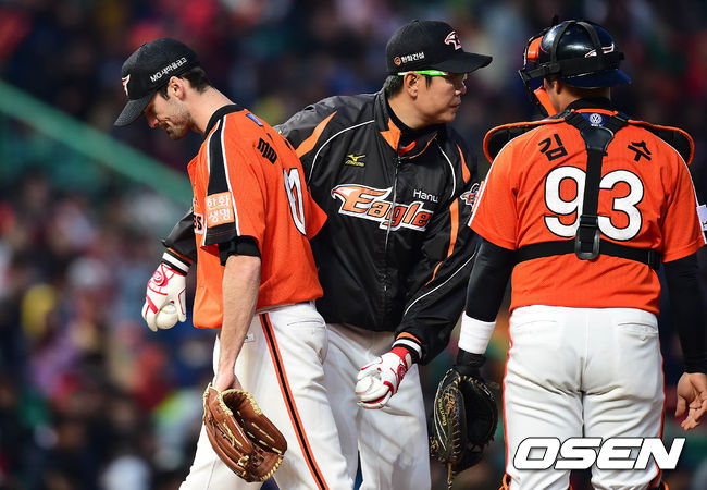 6회말 2사 1루 한화 클레이가 마운드를 내려가고 있다. 클레이는 5⅔이닝 5실점을 기록했다.