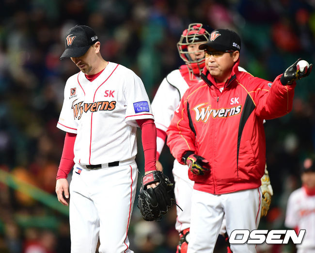 7회초 무사 1루에서 SK 울프가 마운드를 내려가고 있다.