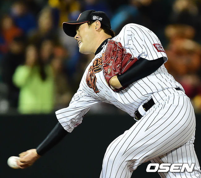 5일 오후 울산 문수야구장에서 열린 '2014 한국야쿠르트 세븐 프로야구' 롯데 자이언츠와 삼성 라이온즈의 경기, 7회초 2사 주자 없는 상황에서 마운드에 오른 롯데 정대현이 힘차게 공을 뿌리고 있다.